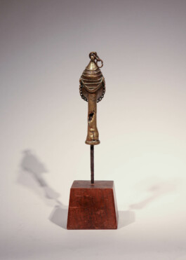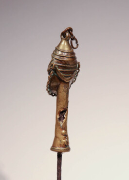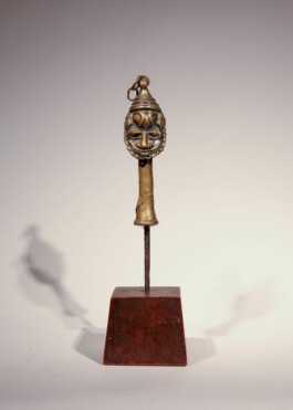 This anthropomorphic brass head set on an iron pin is referred to as edan ogboni, which is a ritual object made by the Ogboni or Osugbo society - which mainly consists of senior and esteemed members of Yoruba communities.[1] It is given to initiates to purify their spirit and to connect them to the earth. This sacred object originally consisted of two figures – one male and one female - joined by a brass chain attached to a loop on top of their heads. It is difficult to distinguish the gender of the present figure, as only the face is depicted. Edan ogboni also functioned as indications of membership and the sculptures remained in the possession of its owner until their death.